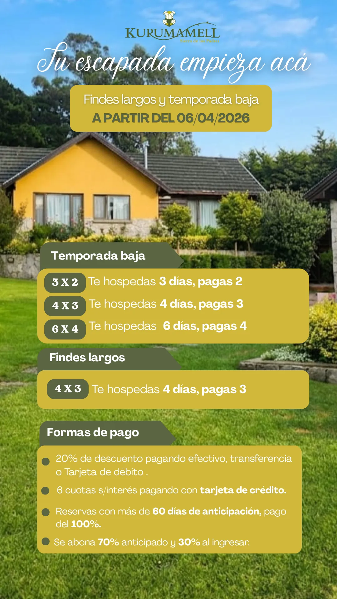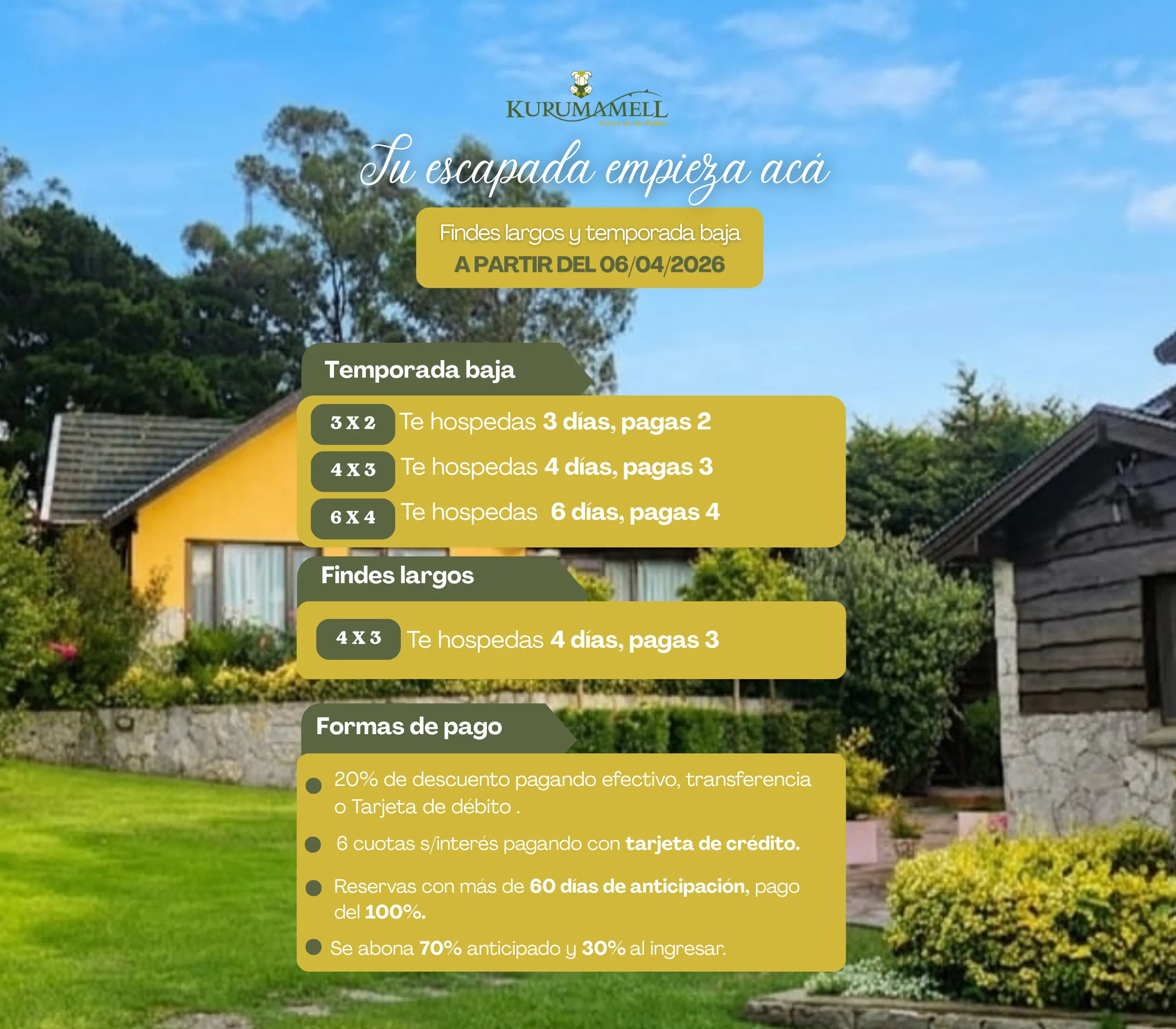 ¡Te damos la bienvenida a Kurumamell, nuestro encantador complejo de cabañas! En este rincón de las sierras queremos que te sientas como en casa desde el primer momento.